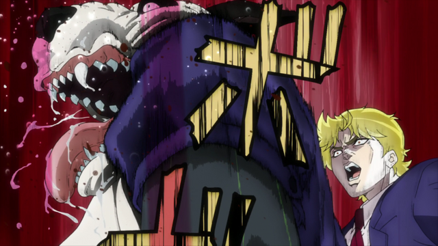 Oh, and Dio kicks Jonathan's poor dog, clearly establishing him as a huge, huge asshole. AND LATER PUTS THE POOR THING INSIDE AN INCINERATOR! This also sets up this series' tendency to do horrible, horrible things to poor, defenseless mutts. It's honestly reached running gag status that any dog that shows up in JoJo's Bizarre Adventure will end up being killed gruesomely. If you have any doubts that Dio isn't actually evil and is just a social climber, this is the scene that really shows how horrible he is.