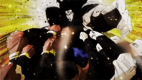 It's a pretty epic scene, mind you -- Jonathan finally finishes the full line of the pre-asskicking one-liner that he has, ending with SUNLIGHT YELLOW OVERDRIVE (or sanraitoooo ierooooh oba-doraibuuuuu!) and a glorious fist barrage (with a couple of unenthusiastic ora's -- it's not until Part 3 that we get a proper ORAORAORA) that will become synonymous with JoJo as a series. I'm not sure whether Fist of the North Star or JoJo's Bizarre Adventure did it first, but the sight of a muscular hero unleashing a flurry of punches is a trope that I am so, so glad exists.