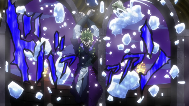 The actual fight between our heroes and Dio is definitely pretty epic. We've got a whole ton of badass lines that flowed a lot better compared to the Jojo-vs-Bruford and Jojo/Zeppeli-vs-Tarkus fights. It's not a matter of a whole glut of dialogue -- it's how you execute it! Also, just to show off Dio's freezing powers, Dio totally freezes Dire and his silly "Thunder Cross Split Attack" and then shatters the poor sod. It's a pretty badass scene for Dio, and I really don't feel much since Dire isn't exactly a character. (That's also a glorious pose Dio strikes as he crushes Dire)