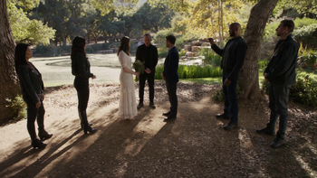 The other big event of this episode is, of course, the marriage of Fitz and Simmons, which was the whole mission that they sent Deke out to the real world to do. It's something that's been a long time coming and honestly feels more cathartic than anything. I do really like the fact that Coulson lampshades that they need to get this wedding over with before some huge catastrophe (i.e. the writers) decide to rip these two star-crossed lovers apart once more, which is hilarious and also had me holding my breath throughout the wedding for something to happen.Oh, speaking of which, we get the huge revelation that Deke is Fitz and Simmons's grandson from the future, which he realizes when he bought a ring that reminded him of his mother's ring, and when he hears Simmons say something that his mother says. It's definitely an interesting wrinkle and sort of makes me care more about Deke as a plot device, I guess? I dunno. Deke isn't a particularly endearing character, but at least the writers seem to have an idea what to do with him that (maybe) justifies the huge amount of screentime the character has gotten since his introduction.