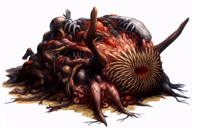 And here it is, our true final boss (or, rather, 'bonus' boss) of Resident Evil 2. With his mutations just going out of control, William Birkin just utterly explodes into a massive glob of flesh, bone, teeth and random organs. And... in this case, I'm not sure which one I like more. The original artwork makes it easy to point out some details beyond the massive Sarlacc bone-maw, like the still-present phallic spine-skull head, and those little remnants of human hands and legs jutting out of his side and dangling from the creature's side. This massive churning maw still ends up being the most eye-catching part of the design, though. This idea, the fact that in battle against the protagonist the whatever-virus gets blown into overdrive and the mutations and regeneration just transforms the final boss into an ambiguous flesh-glob teratoma is going to be a recurring theme in most Resident Evil games.
