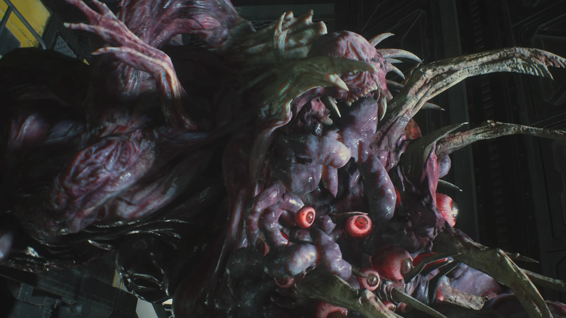 You also fight the G-V in a cramped subway car, and I absolutely love that forward-facing mountain-wall of flesh in the 2019 version. You only really see this form in the brief boss-fight as it tears through and starts to fill up an entire train car. The impact is sure pretty nasty as you have this giant wall of undulating wall closer and closer. The mouth is a bit more puckered and nowhere as exaggeratedly glorious as the original G-V's over-the-top rib maw, but the lighting in that picture and the realization that above the eye is Birkin's half-skull face staring at you with hollow eyes is pretty creepy. Neither picture here shows it particularly well, but the maw is actually concealing the huge eyeball from Birkin's previous forms.