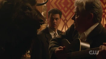 And the main Nate/Hank storyline works well. Nate continues with his daddy issues problem, where his father feels like he's more intent on upstaging Nate by insisting that his way is better, whatever it is, which comes to a head when Hank joins the Waverider crew on a mission to see how they spend their budget (which, considering we know Gideon can fabricate anything, is in itself a bit of a plot-hole-in-service-of-an-episodic-plot). While mocking all the science-y stuff like a strawman antagonist, Hank goes all apeshit and fanboying when he meets with his her, Ernest Hemingway. Who, in turn, becomes quick buddies with fellow "pugilist-author" Mick, leading the three of them to go and hunt the monster of the week, a minotaur hiding in the catacombs of 20's-era Paris.