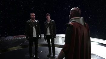 Instead, the far more interesting conversation is when Barry and Oliver walk into an apartment and meet with the Monitor, where we're treated to a speech about destiny, about how it's all a test and that self-sacrifice, while good, is never going to be enough. The Trigger Twins then end up meeting Gary the bartender, Earth-1 Jimmy Olsen the bar bouncer, and Boss Cisco Ramon. And kudos for Carlos Valdes for utterly chewing the scenery. Ultimately, though, between Earth-2, Earth-X, the Mxyzptlk musical and Flashpoint, we've seen enough alternate-universe versions of characters that this doesn't really end up feeling particularly novel, again, unlike the previous two Elseworlds storylines. It's all good for laughs and giggles, but as the closing hour of Elseworlds, it's sort of a disappointment.Basically, the Trigger Twins ends up teaching mafia Cisco how to breach, and then breach all the way to Earth-38 to meet the real Superman and Lois in the Fortress of Solitude, apparently explain everything off-screen... and then, with Superman in tow, they arrive just in time to block Deegan!Superman from frying both Supergirl and Alex with the pretty scary line of "you can BURN together".