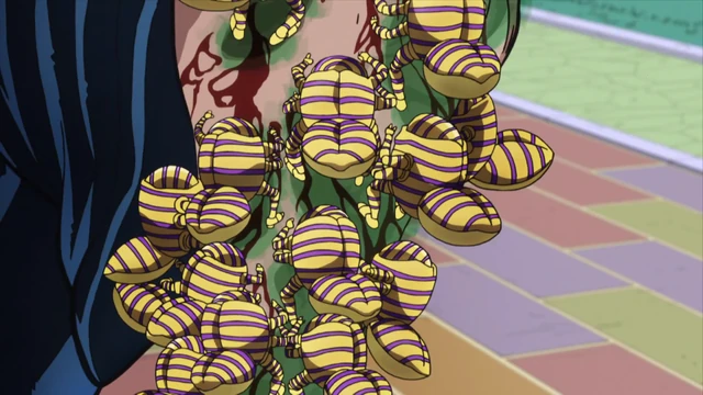 That's how the second episode begins -- we start off with a pretty fun sequence as they go to the bank to collect their winnings and have to face off against a rightfully-suspicious bank teller, especially when Josuke and company apparently forget to look at the name at the back of the winning ticket. Some ink-fiddling with Crazy Diamond, and they end up getting the money... but, once more, Shigechi refuses to give Josuke and Okuyasu's share to them, causing Okuyasu to lose his temper and punch Shigechi in the face. While Josuke and Okuyasu are still very much willing to split it 50-25-25 as agreed, albeit Josuke's holding the bank note, this ends up causing Shigechi to lose his temper, and we get our Stand battle.Harvest ends up being pretty damn horrifying -- it's essentially kind of the same thing as Bad Company, which we saw earlier in this season, but also a bit better considering just how fast Harvest seems to be, and the fact that each Harvest have enough power to gouge out flesh. We also get a fun bit where Shigechi just lies down and have a whole ton of Harvest just move him around like a travelator. Shigechi isn't actually going to kill them, mind you, but he does manage to do some really fun and horrifying applications with Harvest like going immediately for the eye, or to inject alcohol straight into Josuke and Okuyasu's blood to make them tipsy.