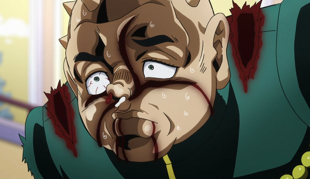 And then Shigechi just fucking blows up like a balloon and dies screaming in fear and pain. There's no nobility to the death of this likable character, there's no epic last stand, and Shigechi doesn't even manage to do anything. It's just a brutal, senseless murder, and I think that's what made this scene feel so disconcertingly tragic especially compared to previous and future JoJo deaths.And, well, I guess it's not completely fair to say that Shigechi didn't do anything, because one final Harvest manages to walk up to Josuke and Okuyasu and give him a single button before blowing up into a puddle of blood.
