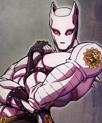 And when Kira shows off his Stand, Killer Queen (who briefly gets a skull face with alien bug-eyes for no damn reason other than to just look extra unsettling), Shigechi unleashes his own Stand, Harvest, one of the easily more powerful Stands in the setting... but one thing about a majority of Diamond is Unbreakable's cast is that for all their talk, they're not killers. No one's been killed by the protagonists other than the rats, and even Angelo was shapeshifted into a stone -- there are definitely parts where Jotaro's cold-bloodedness is even brought up into question. It's perfectly normal for someone to, y'know, hesitate before killing another person, even if it's in self-defense. And that's all Shigechi managed to do -- threaten to rip off Kira's artery.And then Killer Queen shows off his power. He might look like a naked cat-man wrestler, but Killer Queen's ability is to turn anything it touches into a bomb -- tricking Shigechi into taking a coin which blows up in the face. Also love the little detail that Kira and/or Killer Queen has to 'click' the detonator to blow up the thing it transforms into a bomb. (Killer Queen is also one of the biggest sources of JoJo poses in this Part, too)