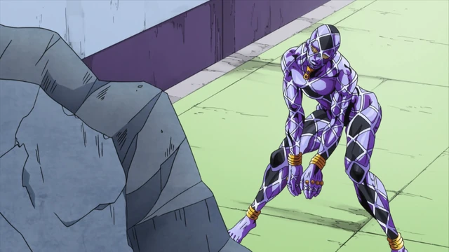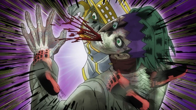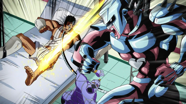 Of course, Echoes doesn't actually kill said ho, but manages to get her to spill information that allows Koichi to direct Josuke into the hospital, and as Josuke quite literally crashes into the hospital, we get Koichi using Act 3 Freeze to help delay Highway Star enough for Josuke to ascend the elevator, finding Yuya... who's wrapped up from head to toe in bandages, and surrounded by three ladies. Yuya apparently has some superhuman smelling abilities himself, and just mocks Josuke as he arrives into the room a bit too late as Highway Star starts draining his fluids.