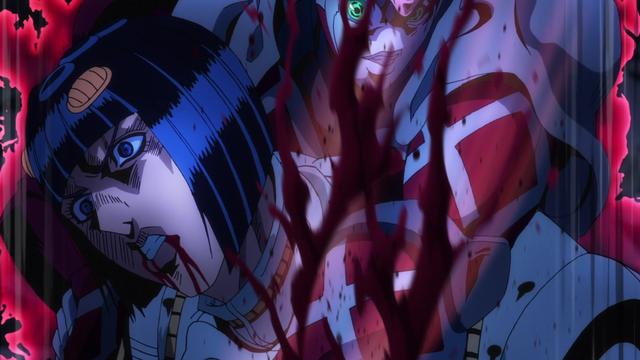 And then the huge action sequence of this episode is the fight between Bucciarati and King Crimson, with some visually neat explanations of King Crimson's ability. I'm not sure if they altered the dialogue, or if the old scan-lations are just utter ass, but the episode definitely explains King Crimson's ability in a way that's not just "it just works, okay?". It is sort of a meme in some parts of the anime community, and while I certainly think that it's a bit of an exaggeration (it's no less complex than some of the later part Stands, or even some abilities in Bleach or Hunter x Hunter which deserve the "it just works" label better than King Crimson). But even with the added benefit of good translations and visuals, King Crimson is still a wee bit too complex for my liking (and this technically isn't even King Crimson's full ability!) but the setup of King Crimson able to essentially turn everyone into "auto-play" for five to ten seconds while only he is able to react to events outside of time is pretty neat... even if it is sort of an overly-complex power for his own good. I've never been a big fan of a complex power making a battle complex because of the sheer amount of shit that it can do that the author himself is overwhelmed, and I think King Crimson is an example of such a thing in JJBA.