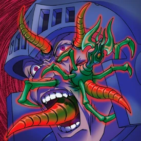 Parasite Paracide, meanwhile, is meant to evoke parasitism, shuffling itself into the opponent's deck and, when drawn, will summon itself on your opponent's side of the field and damage them, while also transforming all of your enemy's monster into Insect-types. An honestly pretty complex mechanic, and one that I'm surprised is actually translated relatively faithfully from the manga/anime considering how many of those are changed. The actual parasite itself is just a massive jumble of insect legs and icky tentacles, culminating in a weird one-eyed bug face with two prongs... which, of course, isn't super interesting, but look at its original, censored artwork! That poor fucker's face is just beeing utterly screwed over by the parasite! Yeah, if this is what happens, and presumably Parasite Paracide takes over the enemy's body, small wonder it's considered as a fellow Insect-type. Pretty neat set of cards!