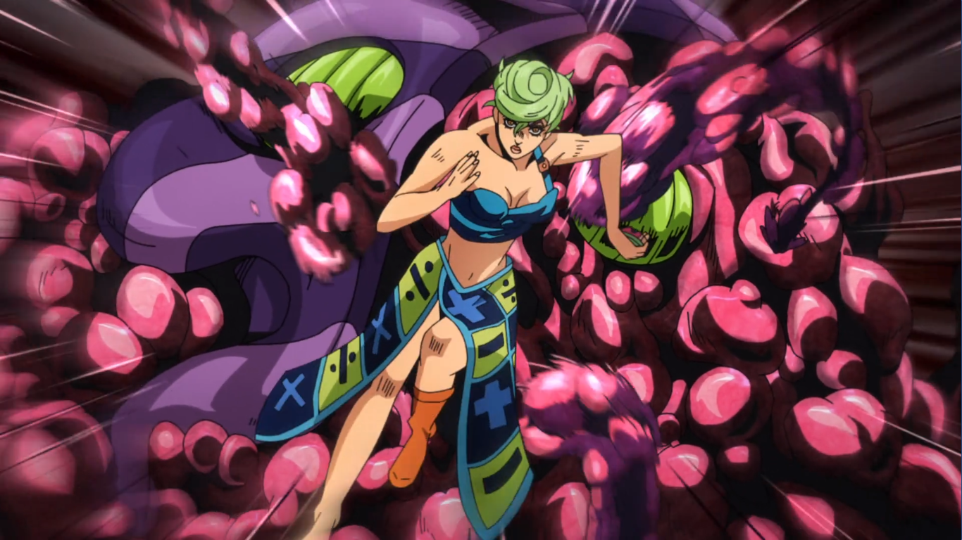 And as Notorious Big is about to attack, Trish herself realizes that Giorno left behind a brooch that transforms into his hand, realizing that the creepy disembodied hand is the ticket to restoring Giorno, and by proxy, the other injured members of Bucciarati's cell. The small problem? Trish doesn't have any fighting abilities, while a chunk of Big is inside the plane and has manifested into this creepy quasi-fetus-esque blobby form that just scoots about.And... and that's the final shot of episode 24, and we move into episode 25 with Trish watching as Notorious Big slowly moves towards the convulsing brooch-hand, and the entirety of episode 25 is basically upgrading Trish from what's essentially just a walking plot device into an actual character that can defend herself, and while it is definitely a bit of baby steps going on as far as female empowerment goes, comparing her to previous female characters in JoJo and shonen manga in general, Trish is honestly being pretty damn badass here. Sure, this is practically the only time she's ever going to fight, but it's a pretty badass episode. She goes from trying to use the opportunity to hide before realizing that she's the only person that can rescue her newfound friends, initially distracting Notorious Big by manipulating chair recliners, while also moving veeeeery slowly to avoid BIG from attacking.