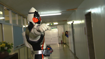 Special mention goes to Nadeshiko, a.k.a. Kamen Rider Nadeshiko, a recurring character in the Fourze movies that's... that's an alien goop called a SOLU who takes the form of a human girl. While initially just established to be something that mimics everything she sees people do, Nadeshiko ends up developing sentience due to Gentarou's friendship and it's a genuinely sweet sequence in the Mega Max movie.