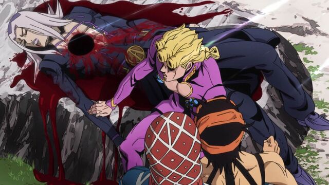 Meanwhile, in the real world, everyone else finds Abbacchio's dead body, and they're horrified. The more childish Narancia's in full denial, demanding that Giorno resurrect Abbacchio, while everyone else's just baffled how the paranoid Abbacchio could let someone get so close. And as they mourn the death of their comrade, turns out that, yes, Abbacchio's will extends to his final act. It's not like Shigechi from Part IV that died mostly for drama, Abbacchio's death, in his final seconds, has been him transforming Moody Blues into the face of the Boss's true visage, and pressed the face to mould it into the stone pillar, meaning that even in death, Abbacchio still manages to give one last figurative middle finger to the Boss. Abbacchio as the more serious and senior member of the group being the one to die is also pretty neat -- I've always find him the least interesting out of the five main cast members (Fugo aside, of course) but the pacing of his backstory in the anime has certainly improved how I perceive him by a fair bit.Ultimately, it's a tense, well-paced episode, even if it does take a bunch of logic leaps and a bunch of "the powers work like this because, um, we kind of need it to". Honestly, that's my biggest problem with King Crimson as a whole, where even moreso than any other JoJo Stand, its powers seem to vary from encounter to encounter. Still, I'm ultimately a fan of this one, and while Abbacchio's death is partially done for shock value, it's also a neat little development in the story. Coming off of the mostly-everyone-is-safe Part IV, it's nice to build up a stronger core cast (compared to the relatively one-dimensional casts of Part II and III) and actually make it mean something that a member of the group dies. Mostly this episode's great thanks to the follow-up to the Doppio/Risotto scene. We're basically in the endgame of Vento Aureo at this point, with only four main characters left, and the final arc of them hunting the boss beginning in the next episode.