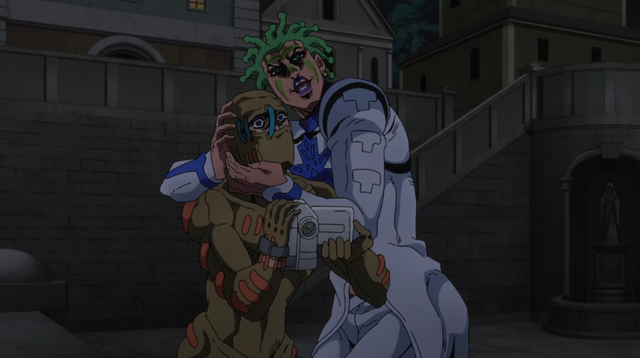 Meanwhile, our heroes finally arrive in Rome, but when they witness a bunch of drunks arguing, one of the drunkards gets half his body ripped off when his friend drags him off from a streetlight, in typical JJBA horror fashion. Also, the parts where his body is ripped off is covered with green moss, which has to be such a huge relief for the censorship team. And as the other dude jumps off from the staircase, his entire body just dissolves away. Mista's attempt to pull out his gun ends up causing his hand to be covered with the same moss.