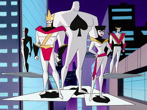 - The Royal Flush Gang makes their debut in the DC Animated Universe in this episode, and they are based on a recurring, ever-rotating group of five members that menaced the Justice League as well as other villains. In the DC Animated Universe, they would be retroactively added to the present-day timeline when two separate prior incarnations of the Royal Flush Gang battled the Justice League in Justice League Unlimited.