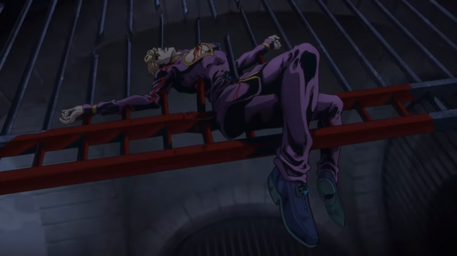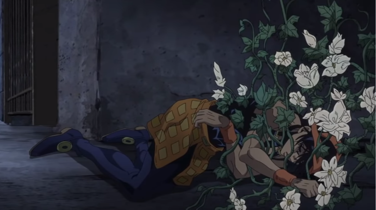 And then, of course, the surprise revelation that Narancia-in-Giorno was just killed off brutally off-screen, impaled bloodily on a bunch of railings above them, pierced like shishkebab.