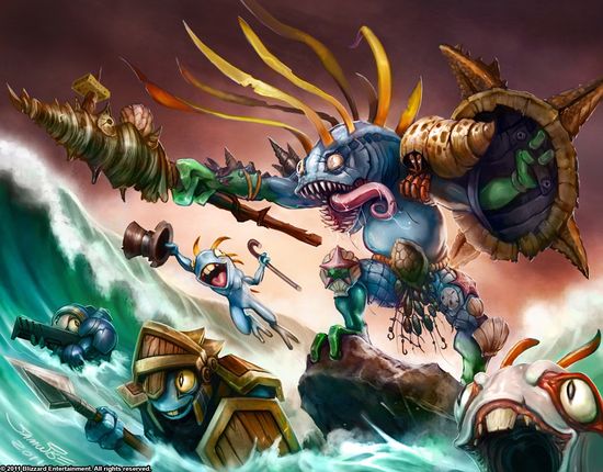 These two legendary cards are original to hearthstone. Zapp Slywick is a giant, mutated goblin who seems to be vaguely associated with the Boomsday Project? The art's ambiguous enough and he could just be a generic crazy goblin inventor. King Bagurgle is a TCG-original character, debuting in the TCG. Bagurgle's artwork was previously used in Hearthstone as the uncollectible "I Am Murloc" card generated by Elite Tauren Chieftain. On Bagurgle's artwork are a bunch of the pet Murlocs (including 'Murky' and the Space Marine 'Grunty') available as vanity pets in WoW, and look closely at Bagurgle's ornaments and you'll spot a bunch of Spongebob Squarepants Easter Eggs.