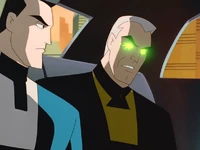 And one of the things that I really do feel that the show didn't quite capitalize on is the fact that Derek Powers is as much a villain as Blight himself. Sure, as Blight he's a lot more radioactive and angry, and physically can throw things around, but I really did enjoy Derek Powers as a smarmy antagonist who took over Bruce Wayne's company through underhanded means, thus giving both Batmen young and old a foe to contend with. Instead, Derek Powers' status as a CEO is basically brushed over and he gets discredited around five minutes into this episode by him losing his temper and his skin flaking off. Not even the dual identity thing is something that Terry and Bruce even really figure out themselves (the closest the two Batmen get is to find that there's a connection between the two after a dropped ID card), which I felt was a massive cop-out and easily the most anti-climactic thing they could've done. Throw in the fact that he hasn't really been an actual presence in the show since... oh, "Shriek", I guess, and I really do kind of feel like this could've been done better.