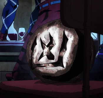 Which is when Mista, technically the main character of this mini-arc, ends up encountering Rolling Stones, the antagonist-sort-of of this arc. There is a rock on his chair with the words "bad luck" on it, and a bunch of words with "kill me" appears on his fingers. But Mista shrugs most of it off since the rock disappears, although he keeps getting extra-jumpy as he looks at random rocks in the street, leading to a hilarious shot of Mista getting the "menacing" kanji sprouting out of a rock. And as Fugo and Bucciarati see Mista off, Bucciarati decides to stop and follow Mista, noting that maybe a Stand might be involved. The episode ends as Mista meets with the sculptor, Scolippi, in an elevator, and he immediately unleashes bullet hell onto the rock-like stand... which transforms into Bucciarati's image.