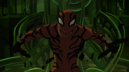 These two episodes are basically sort of following up on plot threads introduced in season one, and it's... I'm not sure if I like Ultimate Spider-Man basically turning the Dr. Octopus and Green Goblin stuff into recurring villains as opposed to arc villains. There's a distinctive difference between villains that keep showing up every couple of episodes to be a menace, or to have a villain whose conflict is built up across multiple episodes. Green Goblin, in this episode, ends up being reduced into basically the former. He shows up, attacks Spider-Man and his buddies, and goes after his "son", who, in his warped mind, he has ended up considering Peter Parker more of his son (thanks to the whole "Spider-Man was created because of Oscorp science" stuff) than Harry, and injects a perfected version of the Venom symbiote. Which turns Peter Parker into this show's version of Carnage.Which... yeah, I guess you can't really get a proper Carnage adaptation in a lighter-and-softer kid's show, but Carnage is honestly treated like an afterthought in an episode named after him. Unlike the slow buildup to "Harry Osborn is Venom in this continuity", the fact that Carnage is just a glooped-up Peter Parker lasted for all of three minutes as he throws around the Junior Avengers, before the symbiote goes back to Harry.