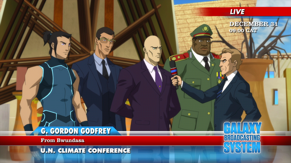 And, of course, this just seems like another filler episode. A bunch of rebel-terrorists being angry at the U.N. and Lex Luthor for legitimizing General Mbarra. And while the Outsiders do battle against the assassins, we get scenes of Lex Luthor asking Mbarra permission to 'make a call'. And while the Outsiders protected the civilians for sure, it's yet another showcase of Halo taking a mortal wound (via throat slash this time), and, more importantly, seen by the public is Kid Flash being thrown across a courtyard by an explosive dart. Bart's okay and honestly unharmed, but it ends up being something that the media ended up spinning as the Outsiders being irresponsible... something that probably doesn't help that Kid Flash's hero moniker has the name 'Kid' plastered on it.Not helping matters is the actual Flash showing up to rescue G. Gordon Godfrey and zip around and round up the B.I.F. assassins, while the Outsiders were somewhat struggling to contain the situation. There was no doubt that the assassins would've done a whole lot of damage if they had succeeded in time, of course, but Luthor and Godfrey ends up spinning this as the Outsiders charging in without any responsibility, being all gung-ho and uncoordinated and disrespectful of international borders... unlike the Flash, who was legitimately called in by the Bwundan government in a system that works. It's an amazing showcase of Luthor's sliminess as a politician, willing to basically pretend to be buddy-buddy with one group of superheroes to defame another... and poor Flash ends up being kinda forced to go along with it lest both superhero teams get some poor press in public.