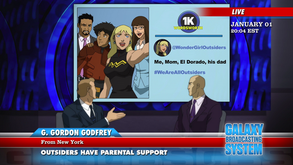 And then we smash-cut to the Gordon show, where he's talking to Lex Luthor who condemns the destructive explosiveness of the Outsiders' battle, which blew up the factory they were in after rescuing the little girl. But thanks to a bit of a late intel from Terra, Luthor ends up talking about how he's totally sure the Outsiders' parents are not on-board with their antics... only for Godfrey to frown and then show off how wrong Lex Luthor is, since all of the Outsiders parents are posting NotTwitter posts of their support. Again, this plays into Godfrey's role as an 'honest' news pundit, similar to how he is all-too-willing to call out the Reach at the tail-end of season two when their claims start to prove insubstantial. Apparently, despite being far more tied to the Light's operatives (what with him being an Apokoliptan and all), Godfrey's not going to make himself or his show look stupid. It's a genuinely unexpected moment, and throws another little wrench into the thick of things since the audience knows that Godfrey is technically allied with Luthor.