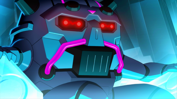 The Overlord also activates some lasers that injure the Mother Box, which alerts walking plot devices Halo and Cyborg, who show up, help to beat up Granny Goodness, and Halo uses her "old god chanting" to cure the brainwashing. There's the neat little subversion that the robotic figure of the Overlord, which is kinda implied to be some sort of giant figure nestled in Gretchen's mansion, is actually a teeny-tiny pocket-sized robot hidden in a small carrying case, but ultimately it is kind of a standard action sequence.