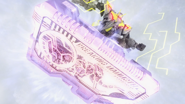 - "PRESS! Authorize. Prog-rise! Giant Waking! Breaking Mammoth!" The noise of transformation and whatnot is too noisy for me to make out the text-to-speech, though apparently it's "Larger than life to crush like a machine." Its final attack is Breaking Impact.