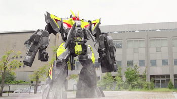 - So, uh, it just has giant versions of the mammoth progrise keys on its arms. With no real explanation other than "well, the toy is meant to interact with them". It's not quite as bad as the stupid Ridewatch faces on the Zi-O mechs, though.