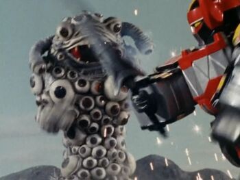 - It can't be helped sometimes, but in the Eye Guy fight, a Japanese girl that's the victim-of-the-week shows up being protected by the Blue Ranger -- particularly egregious because you can see her earlier as an inhabitant of "Rigel II" or whatever. The Ticklesneezer episode also has a giant boy show up randomly holding the Megazord's shoulders. What?