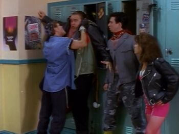 Like, holy shit, it's glorious. Sure, they're not actual punks, and behaves more like an effective version of Bulk and Skull (i.e. what older writers think teenage punks and bullies behave like, then put through an appropriate-for-children filter), but at least it's not quite as comical as Spider-Man 3's attempt at making Peter Parker a douche-punk, y'know? They also get a costume change, which is glorious as shit -- particularly on Billy's part, and my god, the scene is just glorious.And y'know why it's glorious? The hammy bit where they were just being dicks to the confused Jason, Zack and Trini is very forgettable, but when they actually approach Bulk and Skull being their usual selves and essentially show off what real bullying can be, it's pretty great. It's a combination of having Bulk and Skull as a yardstick, and also because these four are probably the best actors among the regulars. Seeing Bulk and Skull genuinely unnerved at what they know as the geek and the girly-girl suddenly act all tough and uncaring is hilarious, particularly when Punk!Kim gets all up in Skull's face and asks him out for a date and "tear up the town", which is probably a PG-13 codeword for "fuck your brains out" considering the look that Punk!Kimberly is making in that scene. It's hilarious. Bulk tries to make sense of the sheer improbability of Kimberly hitting on Skull, but then Billy hits Bulk in a completely different way, shoving him up against a locker and telling him that they're not the 'baddest boys in town' anymore. It's so hammy, it's so silly, it's glorious.