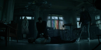 In the present day, though, Batwoman has came across August Cartwright, bound next to the Bat-signal after Alice confronted him last episode. And while Alice spends the episode looking for Mouse (and getting dosed with fear gas because Mouse was over-reacting), Batwoman, in the guise of Kate, brings in her father Jacob to deal with August. Jacob heads off to save Alice from the fear gas and ends up in a genuinely heartwarming reunion (it's just kind of a shame that unlike the other 'dad' figures in CW shows, I don't quite care as much about Jacob Kane as I do, say, Joe West, Peter Gambi or J'onn J'onzz). But as Kate learns about aspects of Alice/Beth's backstory, particularly the mom-head bit, Kate, too, snaps, attacking the bound August Cartwright and choking him, causing a wound that was inflicted upon August earlier in the episode to burst open and killing the fucker. And that after Kate spends a good chunk of the episode convincing Jacob to not kill August, too!