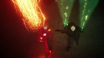 - The original events portrayed here of Pied Piper's fight against the Flash with cars being thrown around took place in the first season of the Flash, whereas Barry knowing that Hartley is willing to work with the heroes happened in a different timeline shown in season two episode "Flash Back". A bit of a change is that Barry is lobbing lightning spears, something that (unless I'm mis-remembering) is a skill he didn't pick up until the second season. Ah, Crisis of Infinite Earths, the perfect handwave for any internal inconsistencies in this show's history!