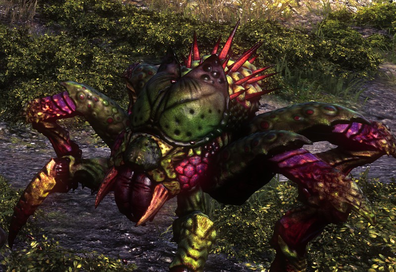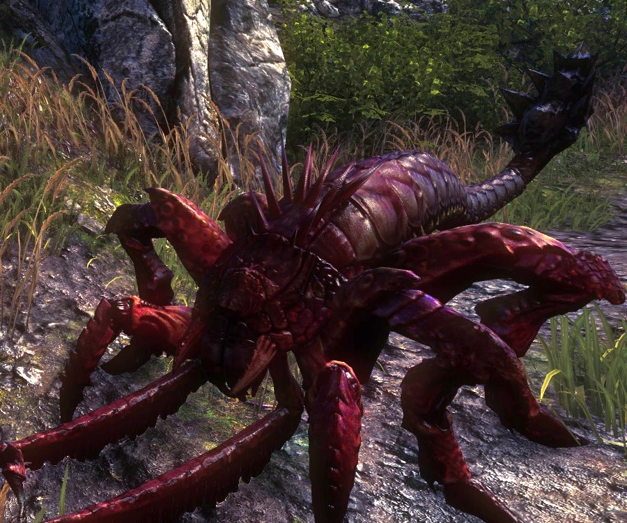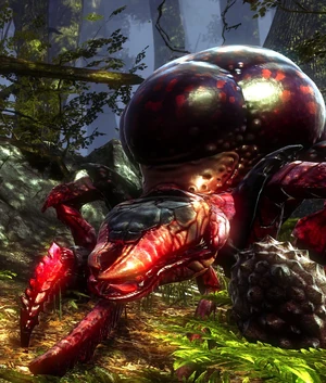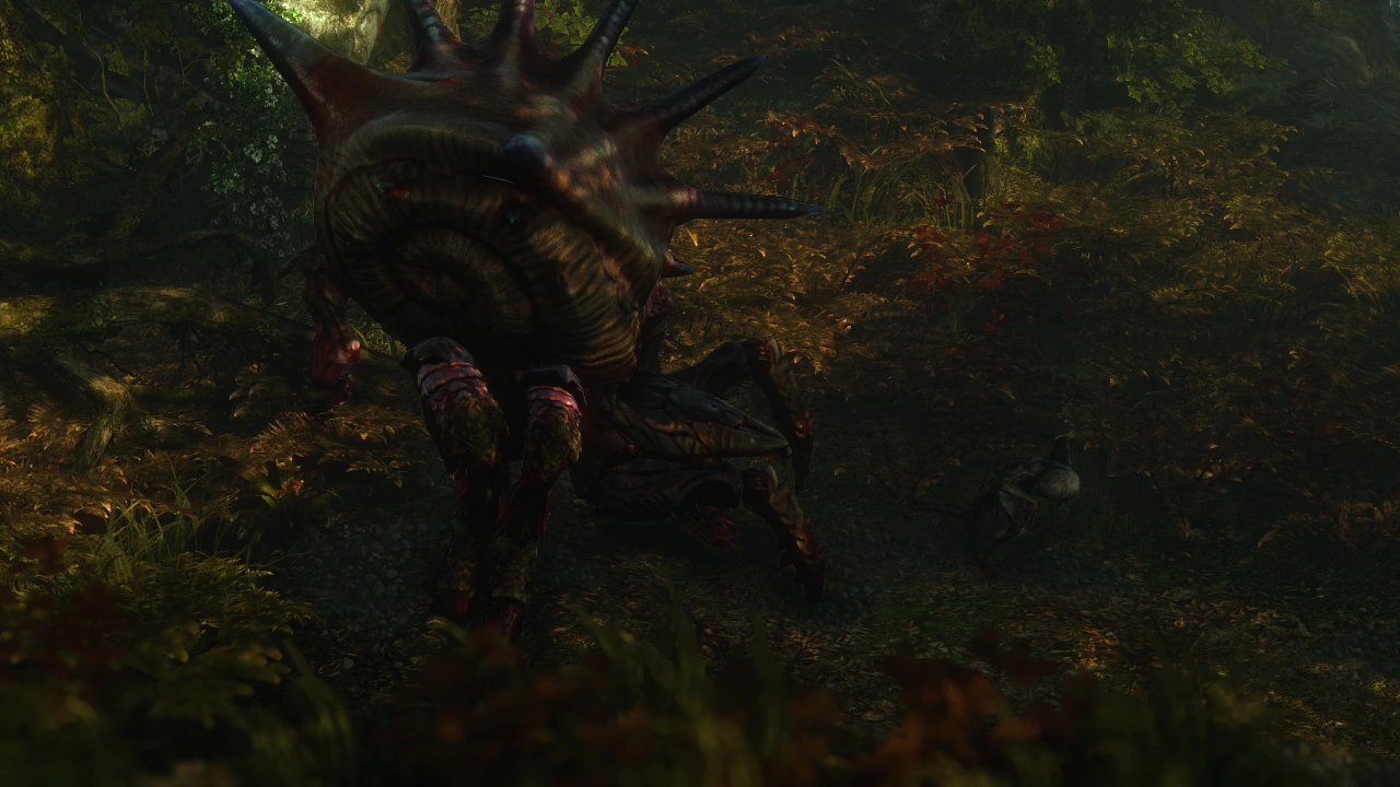 The first time you actually see one is in a cutscene when one of the main characters, Iorveth, lobs a poor hapless Nekker to feed an Arachas he's basically tamed to guard one of his bases. I thought that was cool as hell. The Arachas is described by Geralt's bestiary as a massive creature that essentially lone hunters that rule over a segment of the forest that is its territory, and it's noted that the Arachas's armour is so strong that attacking it from the front is folly, and you have to side-step its charges to strike it from the sides or back. Of course, most of the time you fight the Arachas in pretty narrow quarters, making this a bit problematic. Pretty cool bug monster.