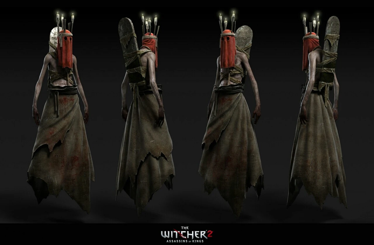 There are a bit more of these intangible ghosts and specters in the first and third game, but in Witcher 2, the primary spooky incorporeal enemy is the Wraith. Three different models exist, but they're always consistent in that they're floating spirits with covered faces, tattered clothes, and two of the three models have what I think is their own gravestone lashed onto their backs -- which I thought is such a cool little addition that doesn't look like much, but makes Witcher's wraiths feel a fair bit more unique than the many, many spooky ghosts that are basically obligatory enemies in a fantasy setting.