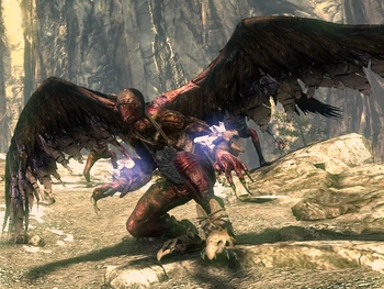 Appearing in the second chapter, which takes place in a bit of a combination of a mountainous region with some foresty parts, the harpies are the common enemies there, giving an extra layer of complication because unlike all of the other enemies you've faced before, these bird-women can fly. They're pretty nasty looking, and the team behind Witcher really like to take gross, flabby, half-flayed human bodies to add to the grossness factor of their monsters if the Nekker, Drowner and Harpy are anything to go by. Harpies are pretty standard fantasy monster fare, they're bird-women that attack, maim and steal from humans. These are the 'wings sprout out from the back' variant as opposed to some depictions of the harpy that have wings instead of hands. In practice, being common enemies, the Harpy's ability to fly doesn't really matter since they need to come close to you to attack anyway, and sometimes they land and scuttle on the ground like a bat.