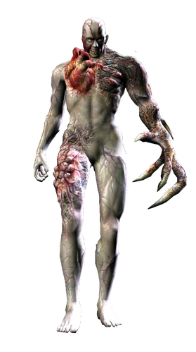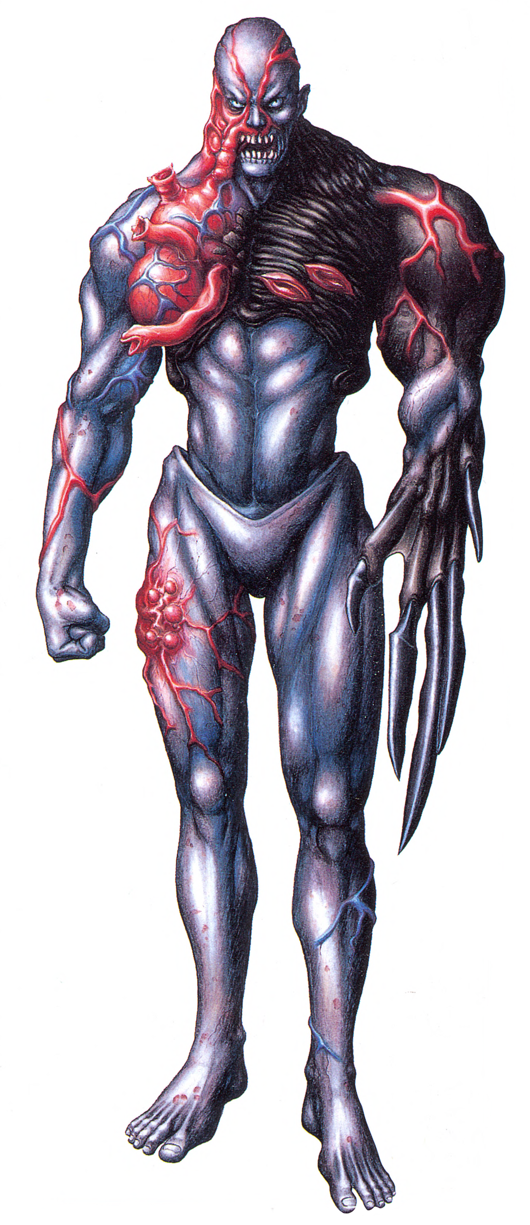 And here's the final boss for the original Resident Evil, the end-result of all of this human experimentation and the most powerful B.O.W. in the Spencer Mansion facility. The Tyrant might look quaint compared to the far more extravagant bosses in subsequent games, but he does set the sage of a giant, implacable man with mutations that make him harder to kill. And he's one of the handful of Resident Evil bosses to not have multiple phases of mutation. It's kind of underwhelming knowing the scope of how Resident Evil's monsters would go, but it's still a pretty cool zombie giant-man! Whether it be the original conceptual artwork or the two models in the games, all of the details of the Tyrant is still the same, with patches of blood and veins running around his body, and his left hand mutated into a massive, gnarly bone-claw. The concept art's bizarre, almost webbed fingers is far cooler, but I also still like the just ghoulishly long fingers of the models. More interestingly, in addition to all the veins that run around the Tyrant's body, we've got a second beating heart outside of the Tyrant's body! Oh, neat, a convenient Legend of Zelda style weak point, right? Wrong! That second heart is there for a reason, there as a secondary blood pump that only helps the Tyrant during growth, and is a sneaky little subversion to more genre-savvy gamers that would immediately assume that it's a silly design flaw.