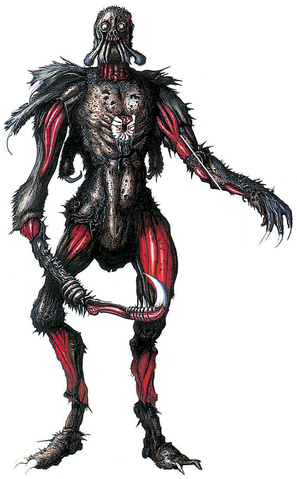 The Cerberus are zombie Doberman dogs! And I feel like the artwork best captures the wretched terror of zombie dog. I am a huge, huge dog person, but I would still admit that angry larger dogs just give this vibe of 'oh shit, don't fuck with this thing' aggressiveness. And the Cerberus, with its glazed-over white eyes, the exposed flesh at the side, and the half-rotten face? Yeah, a really effective deterrent for sure! Let me tell you, a half-rotted zombie dog is a thousand times more terrifying than just a regular skeleton dog. The Cerberus is very much iconic in the game for being the reason you're trapped in the mansion -- a massive pack of these Cerberus prowl the outside of the mansion and essentially locks you into the railway that the game designers want you to go... but then sometimes they'll fucking burst in and try and murder you anyway. The Cerberus are created from the Beta Strain of the T-Virus, which I think is meant to lean more towards being programmed hunter BOWs.
