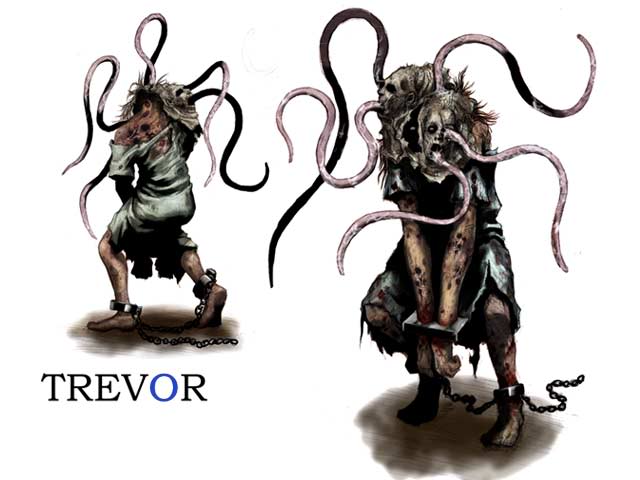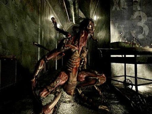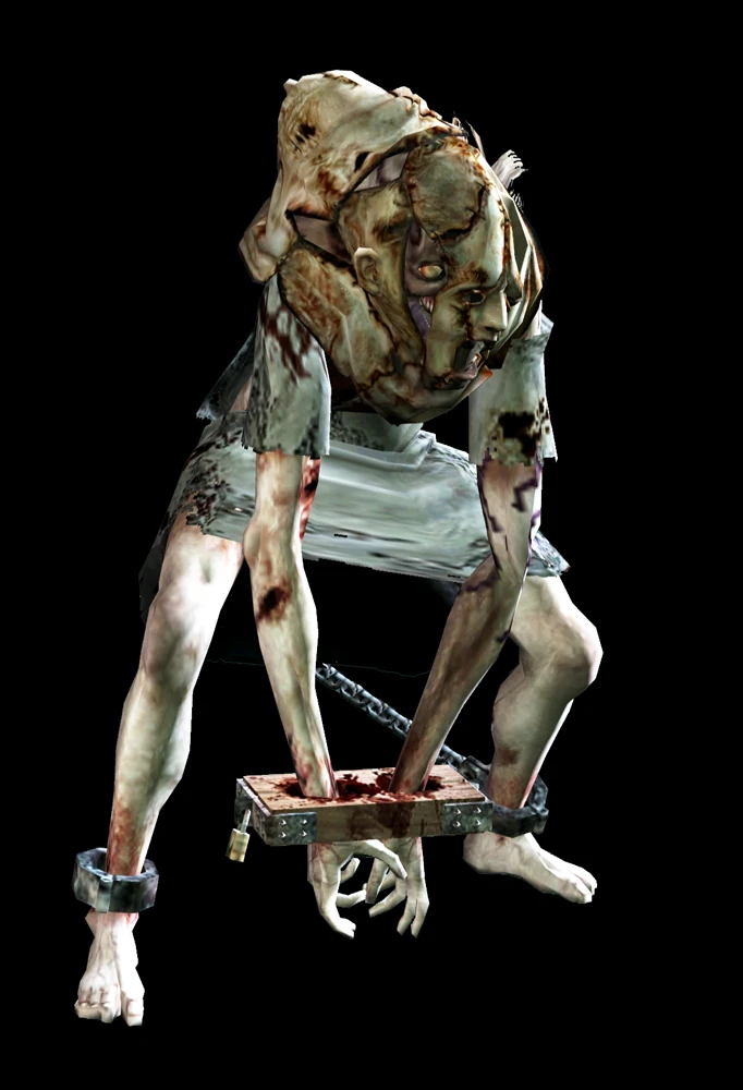 In a pretty sad, sympathetic turn (and your characters discover this as they gather fragments of Lisa's madness-induced diary ramblings as well as research notes), poor Lisa's mind has regressed into thinking that she's still the same, cute little girl before she got turned into a bioweapon, and still looks for her mommy and daddy.... even though, as you can see in that picture, she's skinned the faces of the two fake Umbrella Corporation agents that masqueraded as her parents, stitching them as some sort of a hideous flesh-mask because she's 'holding on' to their faces until mommy and daddy come home. Pretty sad, and I do like how the design really does give her a threatening look (especially when the combat tentacles come out) while also keeping her pretty sympathetic with those shackled arms and tattered hospital gown. An awesomely executed tragic monster with a very sad backstory.