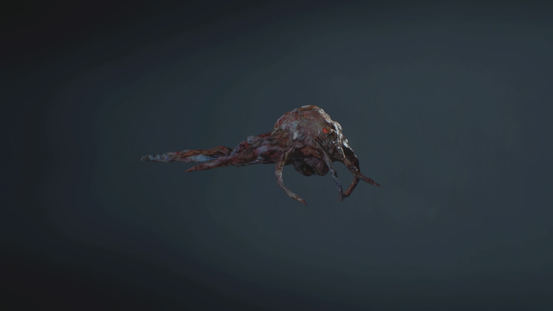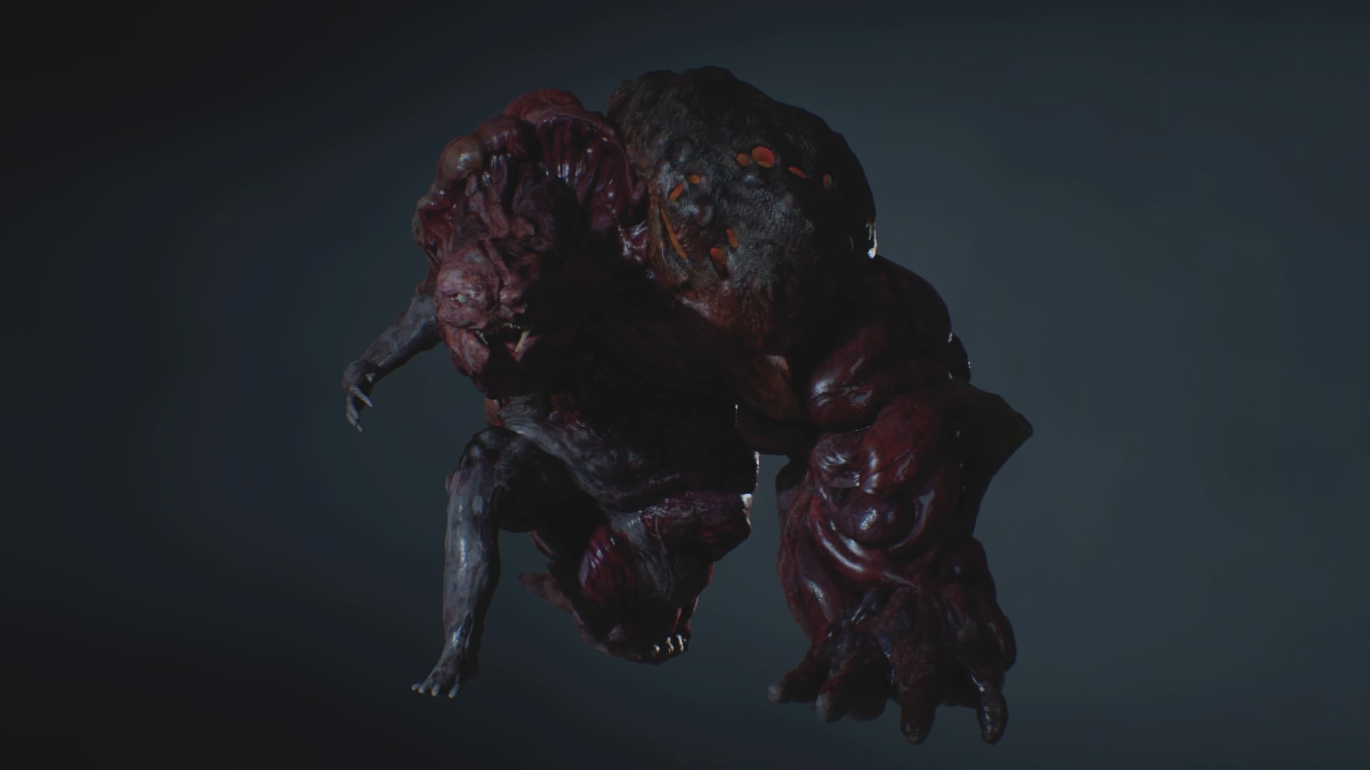 So the main difference is that Resident Evil 2 also features the "G-Virus", an abbreviation of Golgotha Virus -- a very kickass name. The game stresses how much more devastating the G-Virus is, because it will mutate its hosts far, far beyond being just an enhanced version of itself... but to turn them into completely hideous flesh-beasts able to even reproduce asexually via parasitism (because Alien). The G-Virus is also able to repair dead cells, seemingly resurrecting dead flesh, making G-creatures a fair bit more dangerous. These G-Young (or G-Larvae) originally resembled like blind tadpoles with skinny baby arms, but got revamped into a very alien-looking bug-tadpole thing with a single eye and (although it's hard to see in-game) a creepy human mouth screaming below the tadpole body. I'm not sure which I like better, the blind amphibian or the Zerg friend.