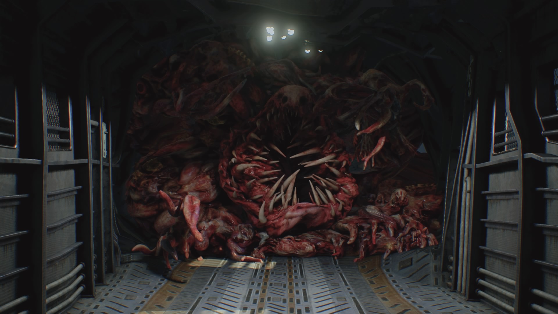 You also fight the G-V in a cramped subway car, and I absolutely love that forward-facing mountain-wall of flesh in the 2019 version. You only really see this form in the brief boss-fight as it tears through and starts to fill up an entire train car. The impact is sure pretty nasty as you have this giant wall of undulating wall closer and closer. The mouth is a bit more puckered and nowhere as exaggeratedly glorious as the original G-V's over-the-top rib maw, but the lighting in that picture and the realization that above the eye is Birkin's half-skull face staring at you with hollow eyes is pretty creepy. Neither picture here shows it particularly well, but the maw is actually concealing the huge eyeball from Birkin's previous forms.