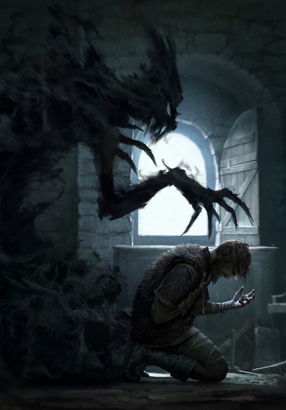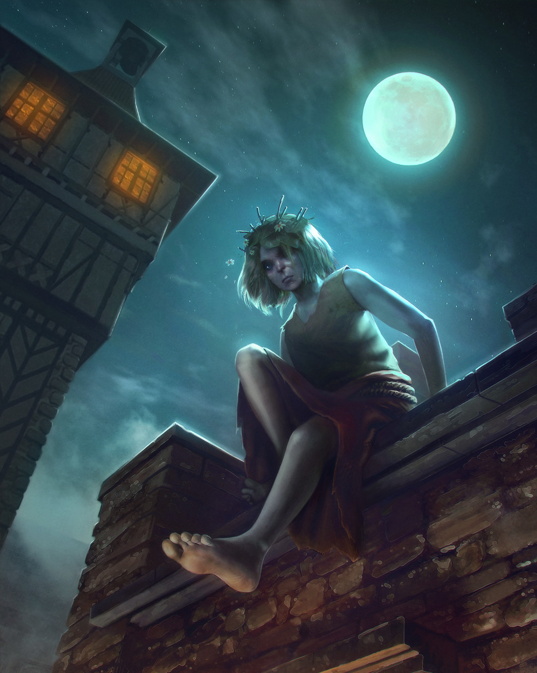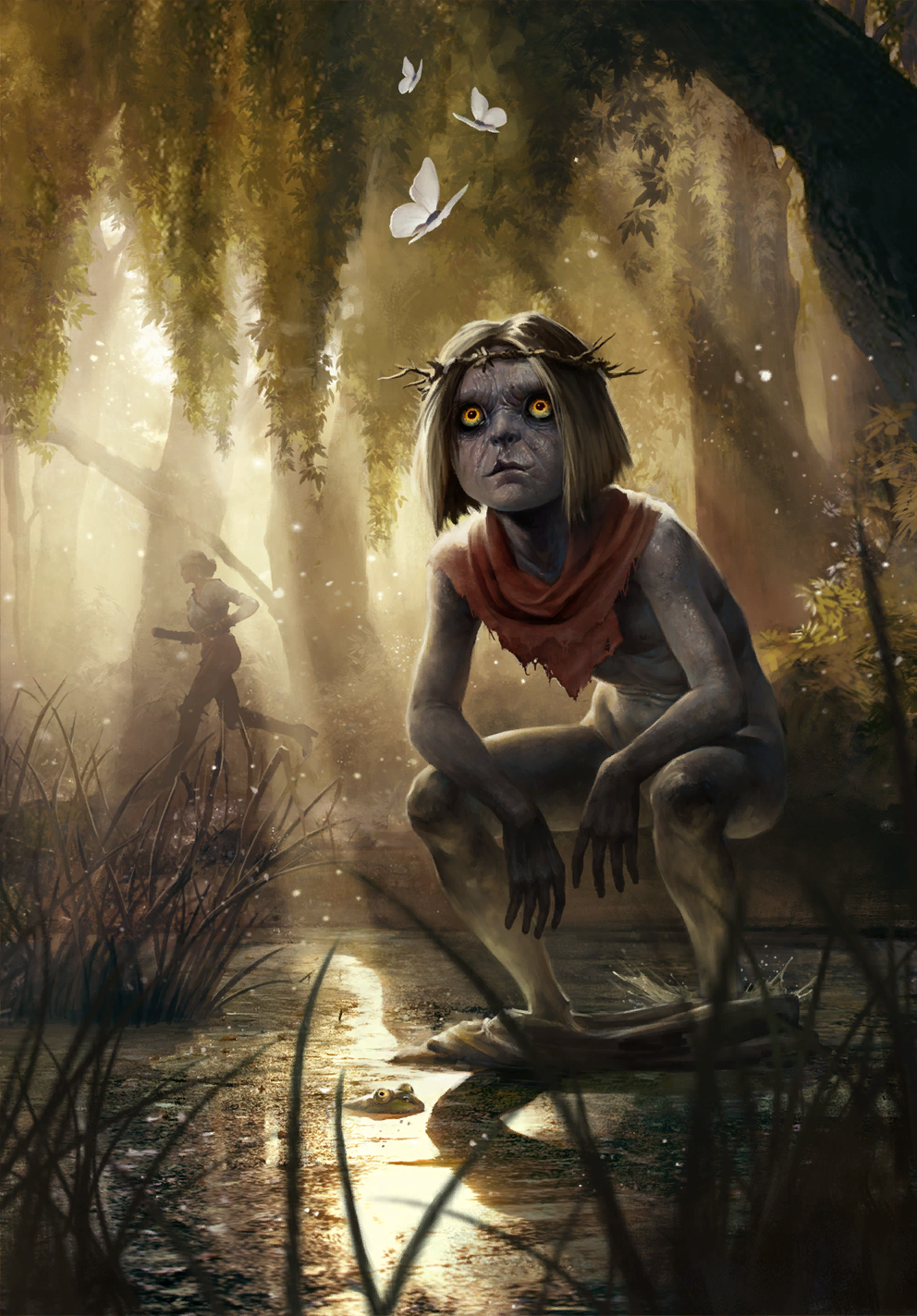 The Godlings, called Bożątko in the Polish version and based on a benign house spirit, are kinda-sorta similar to the concept, although the Godlings of Witcher III aren't always house spirit. Geralt meets two in his journey, Johnny and Sarah, one inhabiting a swamp and being a strange neutral force between the Witcher and the other inhabitants of the swamp, and another inhabiting a seemingly haunted house in Novigrad and basically playing pranks that she doesn't quite know are actually harmful. The Godlings are apparently often confused by humans for Bucca or Lutin (two different goblin-like creatures from myths), and are gray-skinned children with creepy, glowing yellow eyes surrounded by a wrinkled skin and a slightly-broken lip. And their limbs are covered in some sort of black sheen. The idea, I feel, is to make the Godling look somewhat friendly, but extremely unsettling... something that I was definitely completely prepared for. The main story mission where you first meet Johnny the Godling had you meet him not too long after the Botchling one, and I was expecting some sort of hideous creepy motherfucker. And Johnny was certainly creepy, but actually pretty benign. When you meet him the first time he's actually mute and you needed to restore his voice, but I do think that having Godlings unable to communicate by sound would be yet another thing that would make them feel so much more mysterious.