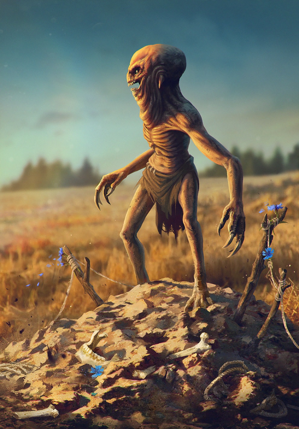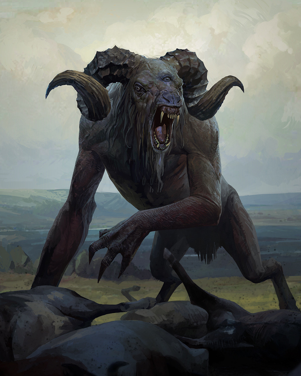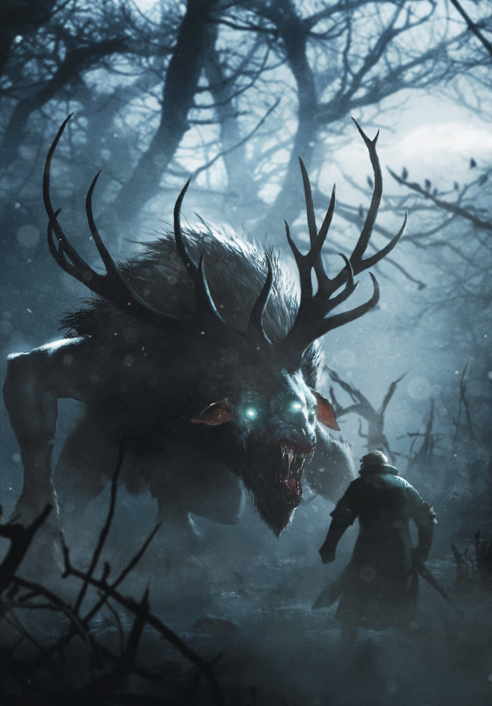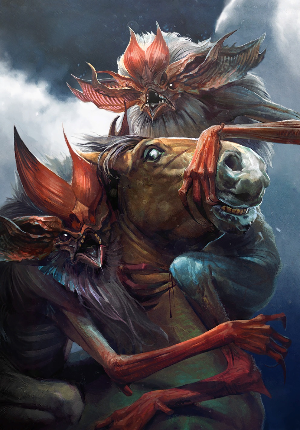 FiendI have been so used to 'fiend' being a synonym for demons in fantasy work, but the fiends in the land of the Witcher are these monstrous humanoid beasts with the face of... well, a fiend, I guess. It's got giant antlers, hair around its pale skin, and the size of a small car. I do like that the face is kind of ambiguous, and I'm not sure if it's based on an ungulate like most of the Fiend's design, or on like a cat skull or something. Fiends and their cousins, Bumbakvetches (yet another variant that doesn't show up) live in swamps and forests, hiding mostly away from humans, but willing to slay and attack them should there be the opportunity. And