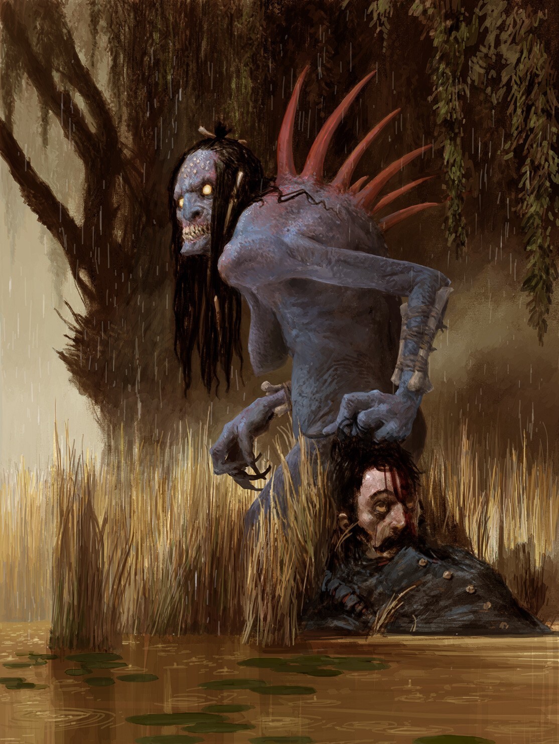A palette swap of the Grave Hag but no less gruesome is the Water Hag (and their stronger sisters, the Bilge Hags), who, as her name implies, lives in bogs and swamps. The game itself offers various origins about where the Water Hags come from. The quote in the in-game bestiary notes that the Water Hags are simply 'drowners' wives', implying them to be the female version of the drowner (and Water Hags are often found commanding small groups of Drowners). One character in the game gives a folktale-esque origin, noting that they are drunk women that wander into the swamps, and are subsequently cursed. And while playing the game, depending on your choices you'll actually see a human character get transformed by the super-powerful Crones below into a water hag. And a tie-in guidebook notes that they are originally beautiful fairies called naiads who fell in love with mortal men and lost their eternal youth. Whether any, none or all of them are true, the Water Hags are pretty nasty.