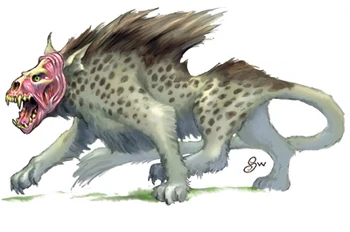 KrensharHuh, okay, didn't expect to see a weirdo-animal so soon. The Krenshar is noted to be a combination of a wolf and hyena, but I don't think any wolf or hyena has that frankly pretty gruesome flayed-dog-skull face. This, by the way, is not always the case -- the Krenshar has 'extremely flexible skin' on its face, and while hunting prey, it can pull back the skin to expose its inner muscles while screeching like a demon. Sort of like a far, far more grotesque frilled lizard or something. Kind of underwhelming compared to something like the Howler or Death Dog or Jaculi, honestly, I kinda wished that there's something more to this creature.