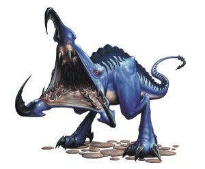 Star Wars than D&D, I still like this utter weirdo. Classified as an aberration, this thing is... how do you even describe it? It's a big fat body with four arms with way-too-long fingers. Its one leg seems to be another arm with knobbly fingers. It's got a weird fish-like face on the tip of its neck with exactly one chin-tentacle, but also has an angry muppet face on its 'torso' with four eyes. As their name implies, their whole deal is that they are pickpockets, going in and out of the ethereal and material planes to steal things with their super-long arms. Despite their bizarre look, they live in the Material Plane and only use their ethereal phasing to stalk their marks. I actually like just how bizarre this thing looks; I don't think it would be too out-of-place for something like this to show up in like a