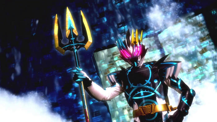 Rintarou transforms into Blades, but gets stopped by Ryoga, who has probably one of the coolest toys ever -- his sword's blade can be detached and he switches the handle and the blade to form a trident. Obviously the actual tokusatsu suit is wielding a practical trident for stunts, but hey, I actually like Kamen Rider Durendal's form a lot. I think it's the helmet, though I've always had a thing for aquatic Rider suits. They might be the villains, but man, the Shindai siblings have two of the best-looking suits in the entire show. (And one of his jingle is 'ocean splash splash', which is funny)